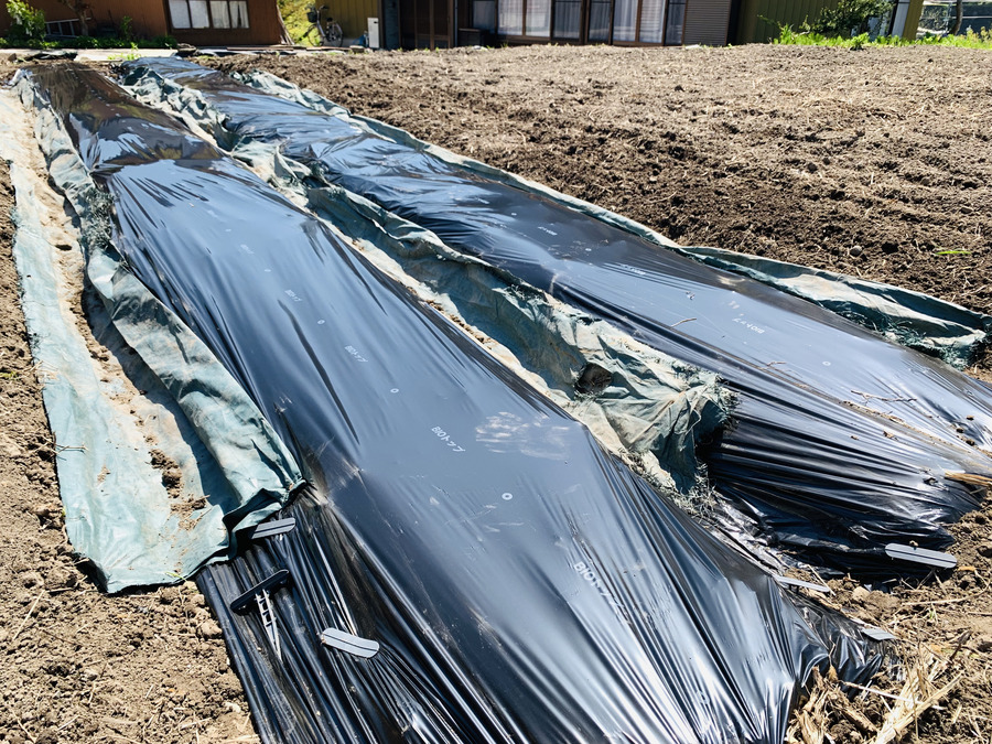 まずは土を耕し、畝(うね)を立て、防草シートとマルチを敷いて、雑草対策もバッチリ。