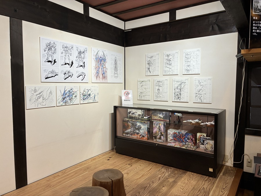 新たな設置場所である【道の駅たいら・五箇山和紙の里】では、河森正治さんの紹介パネルや平村の思い出を語る動画、作品絵コンテ、プラモデル等も見ることができます。