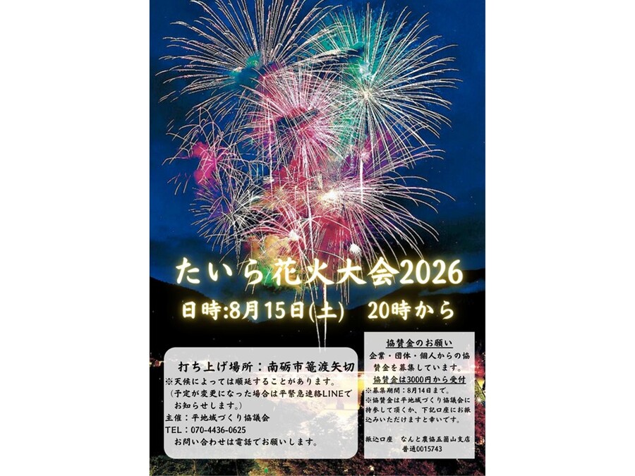 毎年平の夏を鮮明に彩る"たいら花火大会"。